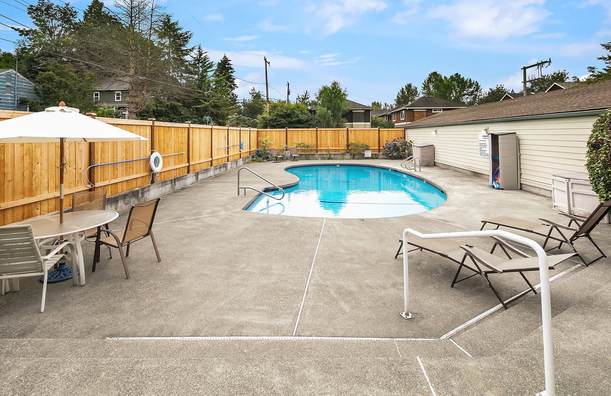 Open floor with large living room, with a cozy wood fireplace. The spacious kitchen opens to the beautiful dining area, with its tall windows that bring in lots of great natural light. Two large bedrooms with ample closet space. Tons of storage, including two additional storage units – one just down the hall and the other right in front of the covered parking space. Full size washer and dryer in the unit. Beautiful club house to host your parties and a lovely pool. Strong HOA. Pets welcome. Easy access to local transit, UW, Downtown, shopping, parks and more.
