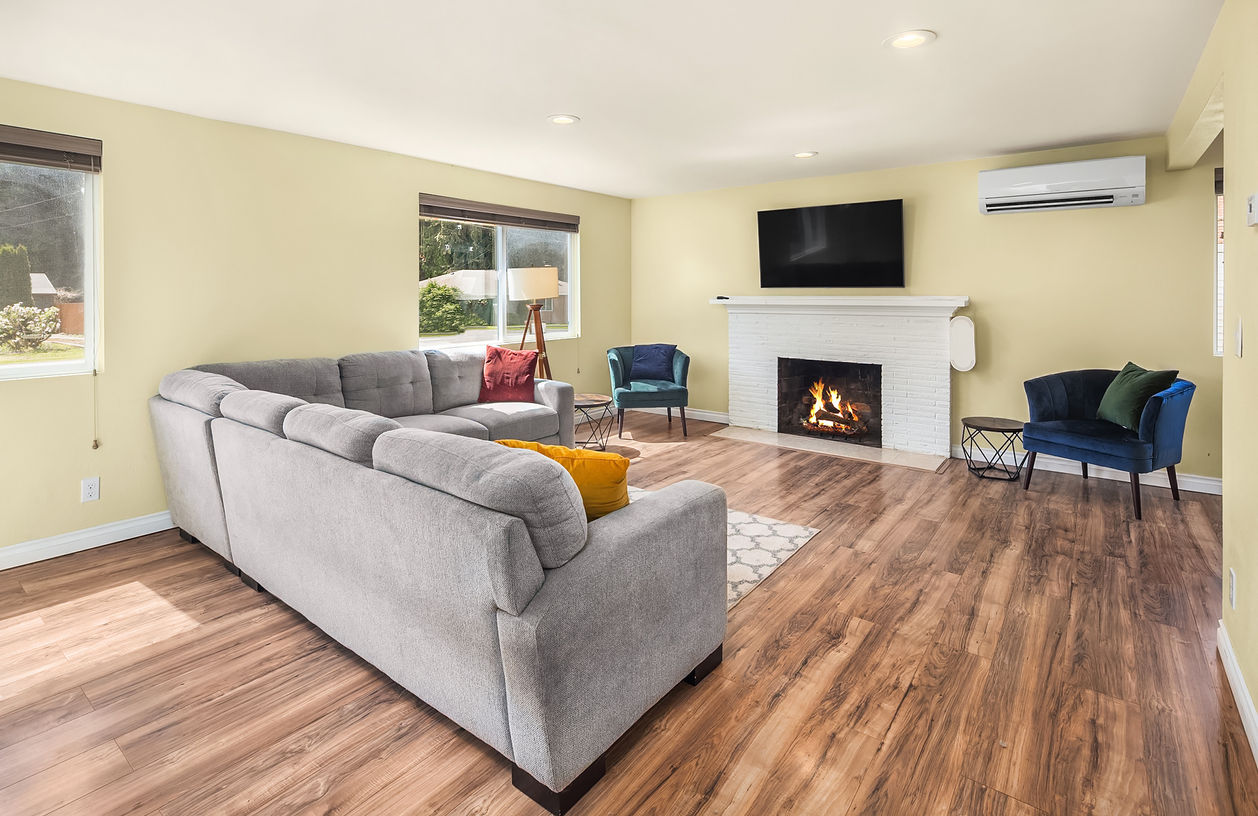 The spacious, fully remodeled interior features large living & dining rooms with beautiful floors and a cozy fireplace. The modern kitchen offers ample cabinet & quartz counter space, and direct access to the fully fenced backyard and deck—perfect for relaxing, gardening, or entertaining. Three of the four bedrooms are on the main floor, including a spacious primary suite with a beautifully updated en-suite bath with double-sink vanity. Efficient mini-split offers heating and A/C year-round. Spacious garage and plenty of parking add comfort and convenience. Easy access to highways, parks, and shopping.